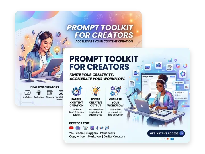 Create a promotional image for a digital product called “Prompt Toolkit for Creators.” Highlight the product name, target audience, and core value, such as helping creators produce content faster, improve ideation, or streamline workflows. The design should feel clean and modern, suitable for creator-economy sales pages and social conversion content.