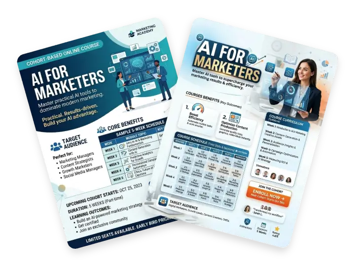 Create a promotional graphic for an online course called “AI for marketers.” The visual should clearly highlight the course title, target audience, and key outcomes, such as improved productivity, more efficient content workflows, and stronger marketing automation capabilities, so viewers can quickly understand the practical value of the course. The overall design should feel professional, structured, and credible, with enough clarity and polish to support conversion rather than just awareness. It should be suitable for an online education landing page, a cohort-based course signup page, or a webinar registration page, and should immediately convey the impression that this is a practical, worthwhile course to enroll in.