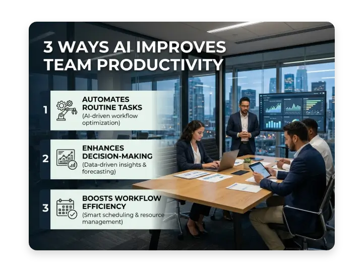Create a professional visual for a LinkedIn post about “3 ways AI improves team productivity.” Use a business-friendly, restrained, and clear style suitable for B2B, collaboration, and productivity content rather than consumer-style social graphics. The image should help the post feel credible and worth reading to international professionals.