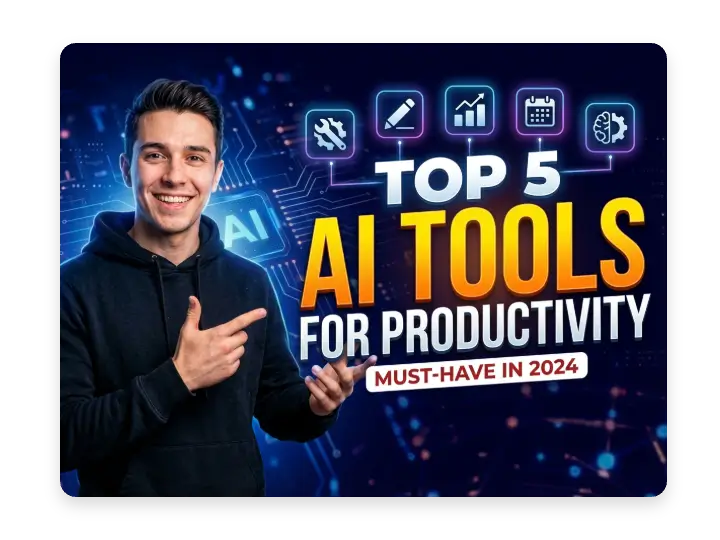 Create a YouTube thumbnail for a video titled “Top 5 AI tools for productivity.” Use strong contrast, clear visual hierarchy, and a bold title treatment so the thumbnail instantly communicates high-value tool recommendations. Emphasize the main text and visual subject to make it more click-worthy, while keeping it aligned with the thumbnail style commonly used by international tech and productivity channels.