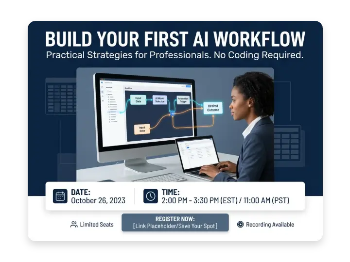 Create a webinar poster for “Build your first AI workflow.” Clearly structure the event title, date, time, and registration area, and use a professional, modern, trustworthy visual style that works across LinkedIn, email invitations, and registration pages. The image should feel practical and action-oriented for working professionals, rather than like a vague conceptual AI poster.